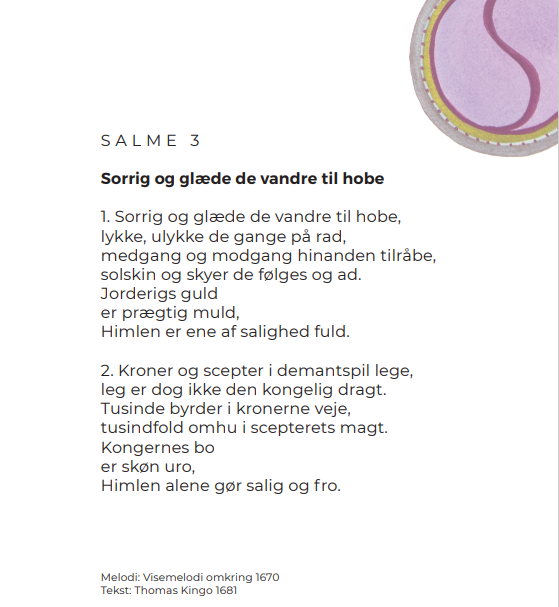 Her finder du videoerne til den tredje salme 'Sorrig og glæde de vandre til hobe'. Den første video er med fagter og den anden er uden fagter. Nederst findes teksten til 'Sorrig og glæde de vandre til hobe' og ude til højre kan du downloade hele salmehæftet til alle salmerne i undervisningsforløbet 'Sangskat'.